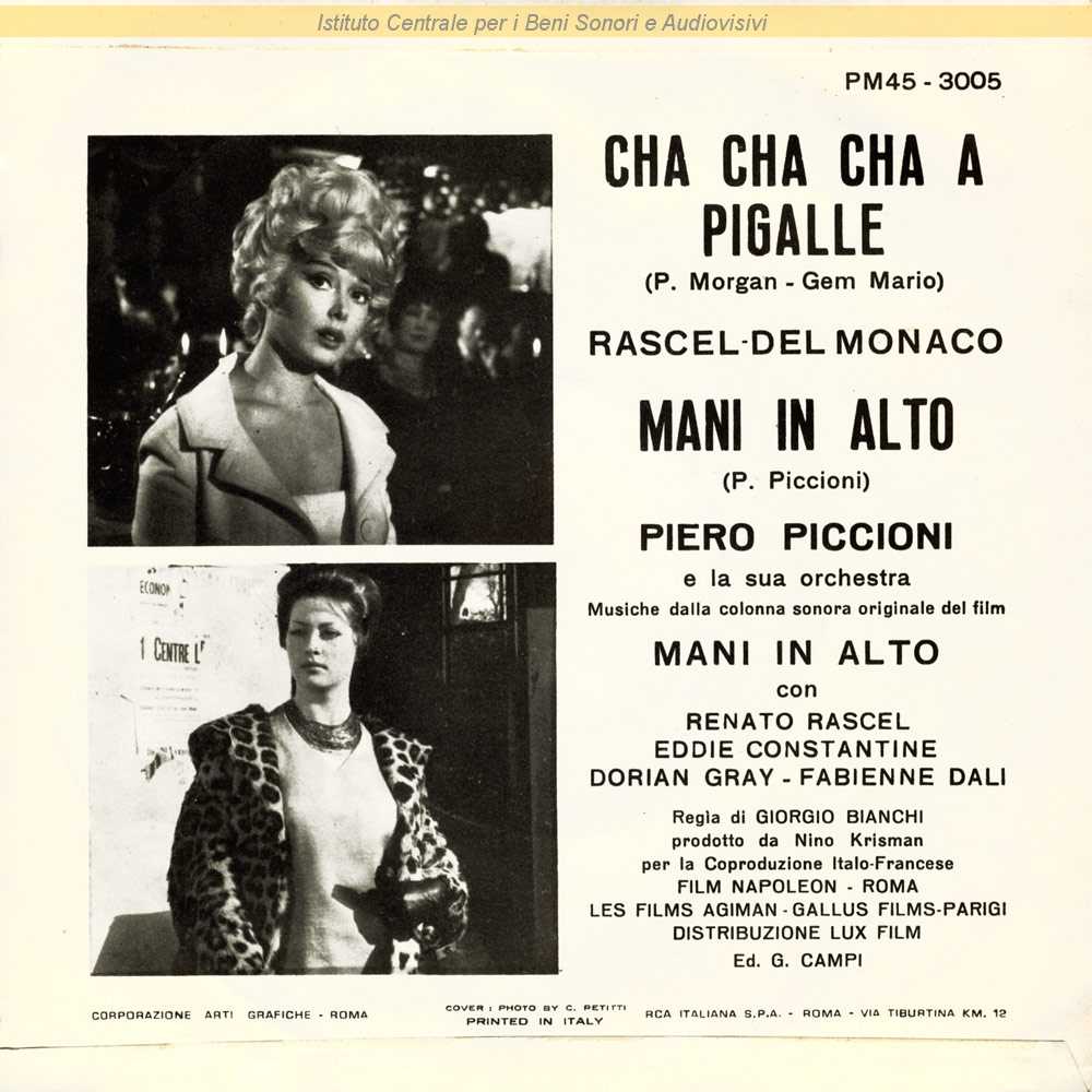 : Dalla colonna sonora originale del film "Mani in alto" (Giorgio Bianchi, 1961) / Fotografia di copertina di G. Petitti / Distribuito da RCA Italiana - Roma