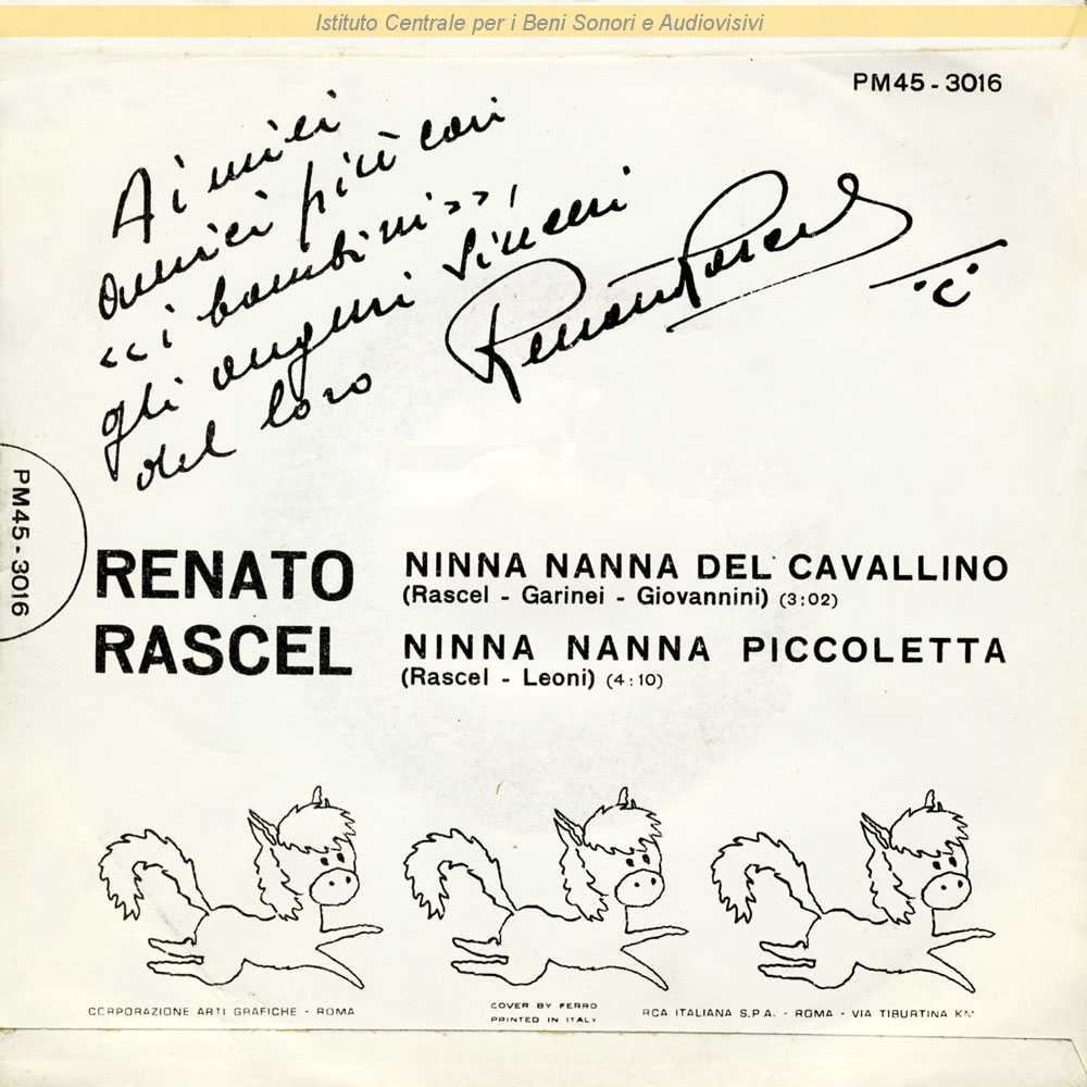 Pubblicato anche su etichetta RCA Italiana con identico numero di catalogo / Lato A: dalla commedia musicale "Attanasio cavallo vanesio" (Pietro Garinei/Sandro Giovannini, 1952)- Lato B: dal racconto "Rascel il Piccoletto" (Renato Rascel, Mursia-Corticelli, 1958)