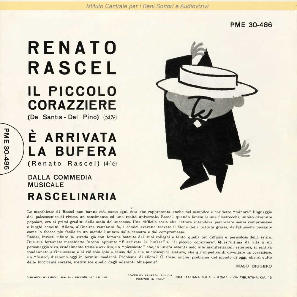 : Dalla commedia musicale "Rascelinaria" (Pietro Garinei, Sandro Giovannini, 1960) / Copertina di Sergio Salaroli e Ferruccio Piludu - Sul retro copertina presentazione dell'artista di Maso Biggero / Distribuito da RCA Italiana - Roma