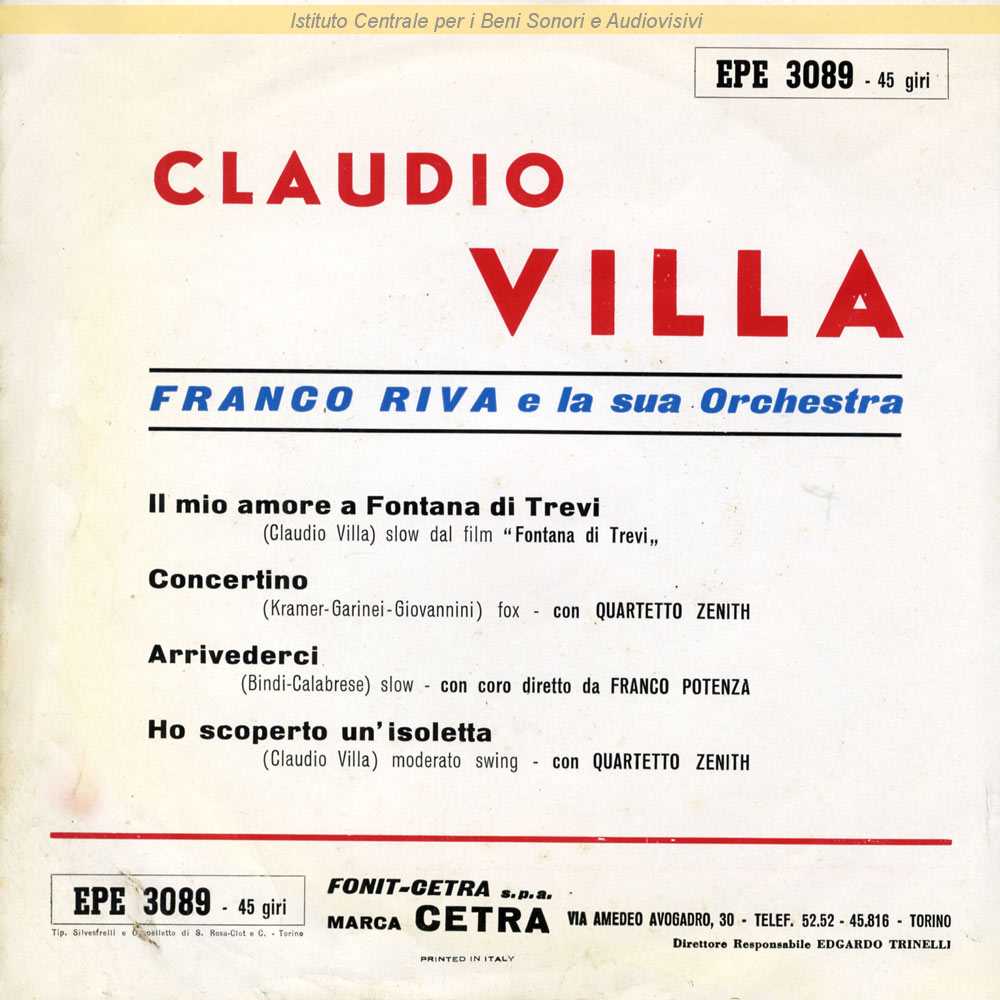: Data matrici: 9 Settembre 1959 / Il brano 1 del lato A è tratto dal film "Fontana di Trevi" (Carlo Campogalliani, 1960)