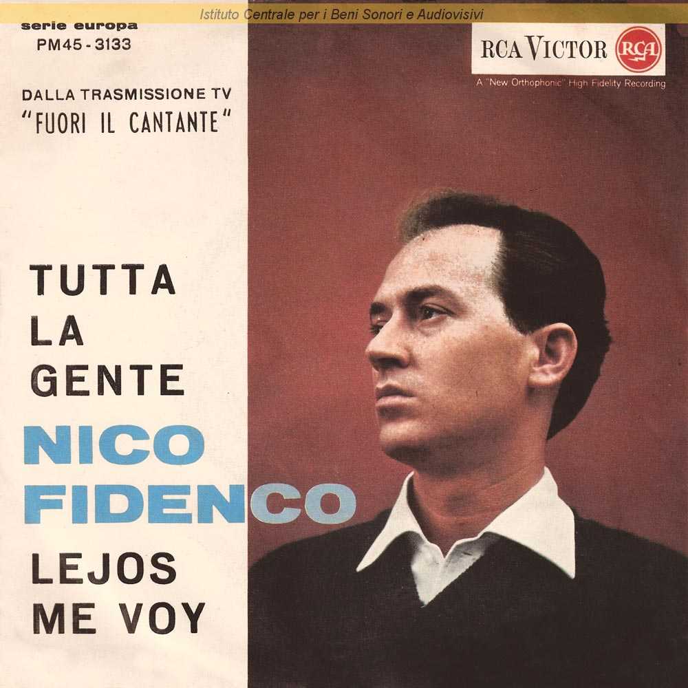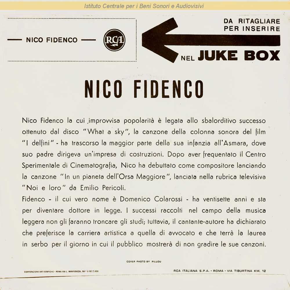 Note: Nico Fidenco è il nome d'arte di Domenico Colarossi / Lato A: Sigla della trasmissione televisiva "Fuori il cantante" (Piero Turchetti, 1962) / Copertina fotografica di Ferruccio Piludu con due varianti grafiche / Sul retro di copertina breve nota di presentazione non firmata ma attribuibile a Vincenzo Micocci / Distribuito da RCA Italiana - Roma