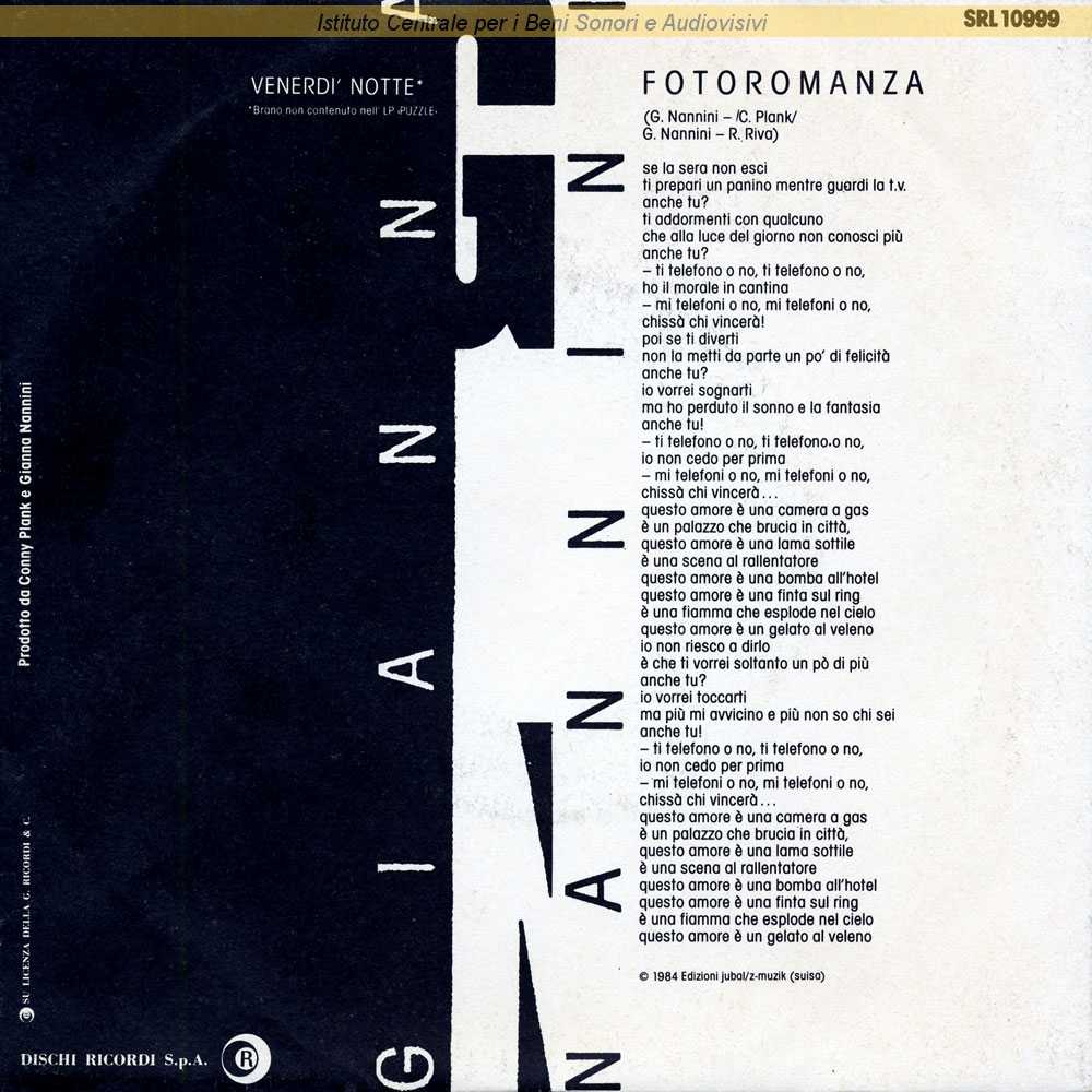 : Sul retro della copertina il testo del brano "Fotoromanza" / Distribuito da Dischi Ricordi - Milano