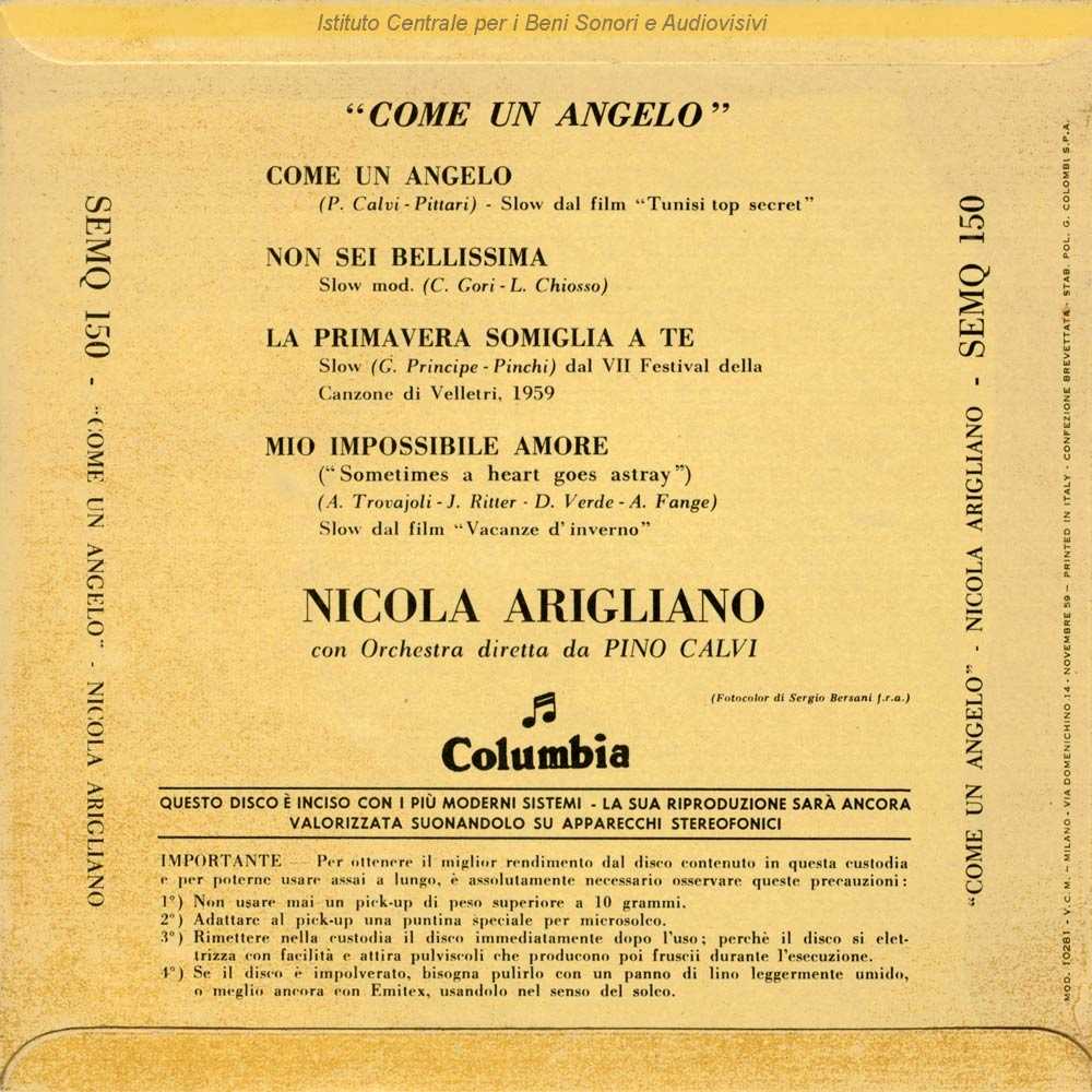 Note: Data matrici: 18 Novembre / "Come un angelo" dal film "Tunisi top secret" (Bruno Paolinelli, 1959) / "La primavera somiglia a te" dal VII Festival della Canzone di Velletri, 1959 / "Mio impossibile amore" dal film "Vacanze d'inverno" (Camillo Mastrocinque, 1959) / Pinchi è lo pseudonimo di Giuseppe Perotti / Fotografia di Sergio Bersani