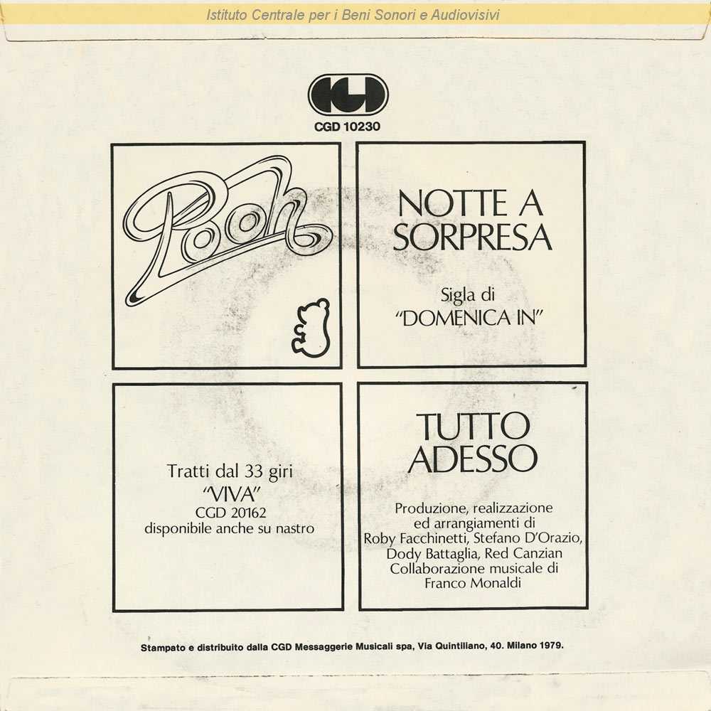 : Data matrici: 16 Novembre / Lato A: Sigla della trasmissione tv "Domenica In" (Lino Procacci, 1979) / Collaborazione musicale di Gian Franco Monaldi / Distribuito da Messaggerie Musicali - Milano
