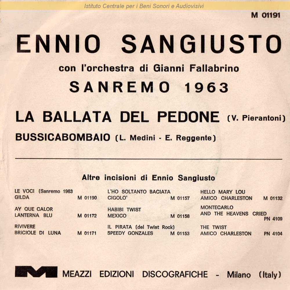 : Data matrici: 30 Gennaio / Lato A: "Festival di Sanremo 1963" / Ennio Reggente è lo pseudonimo di Ennio Sangiusto