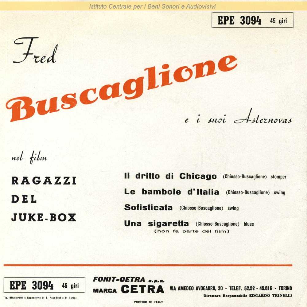 Note: Data matrici: 26 Settembre / Inciso come Fred Buscaglione e i suoi Asternovas / Tutti i brani, tranne "Una sigaretta", dal film "I ragazzi del juke-box" (Lucio Fulci, 1959) / Stampato in due edizioni, una delle quali con copertina in plastica forata al centro ad esibire l'etichetta, con incollata su uno dei lati interni una immagine circolare double-face con ritratto dell'artista, in modo da essere visibile attraverso il foro centrale del disco su ambedue i lati (vedi link "Altre immagini") / Distribuito da Cetra - Torino