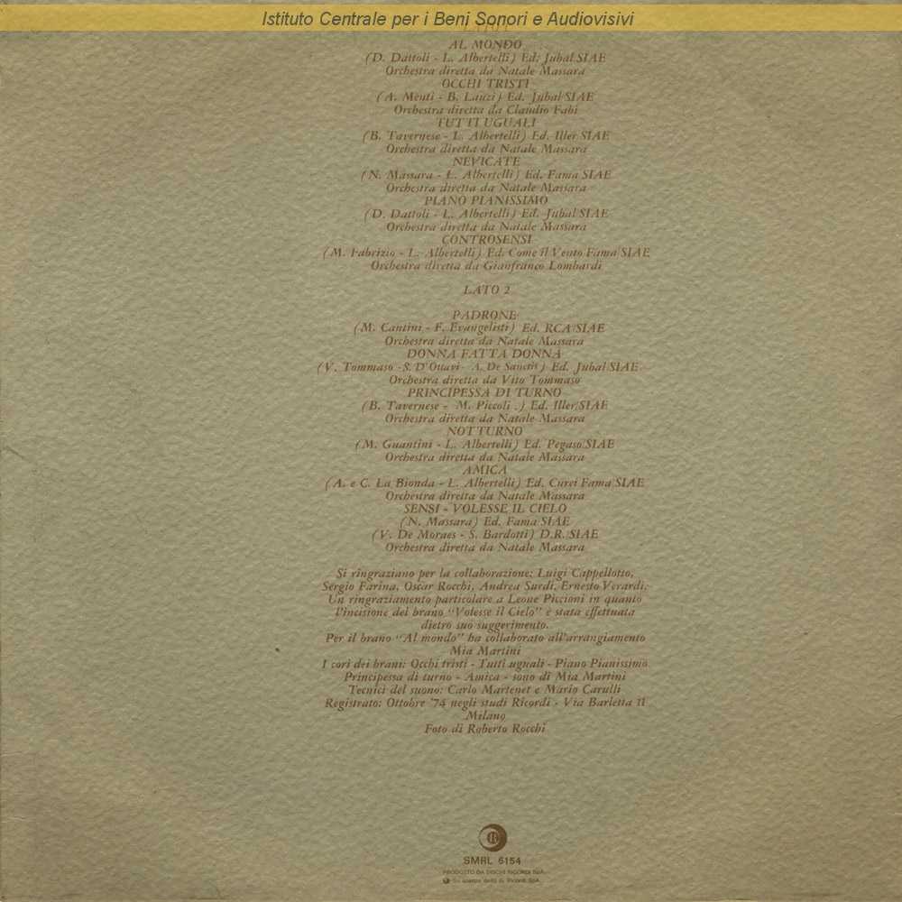 Autori: Luigi Albertelli, Bruno Tavernese Musicisti: Mia Martini (cori) Orchestra: Natale Massara Edizioni: Iller