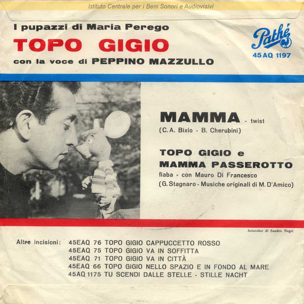 Note: Data matrici: 11 Aprile-10 Aprile / Inciso come I pupazzi di Maria Perego "Topo Gigio" / La voce di Topo Gigio è di Peppino Mazzullo - Il Lato B è un recitato con le voci di Peppino Mazzullo e Mauro Di Francesco / Fotografia di copertina di Sandro Negri