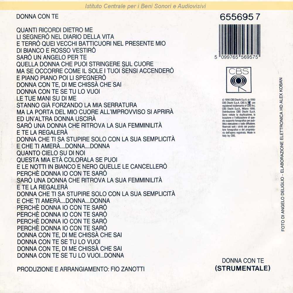 : Data matrici: 28 Febbraio / Lato A: "Festival di Sanremo 1990" / Fotografia di Angelo Deliglio - Elaborazione elettronica di Alex Koban / Distribuito da CBS Dischi - Milano