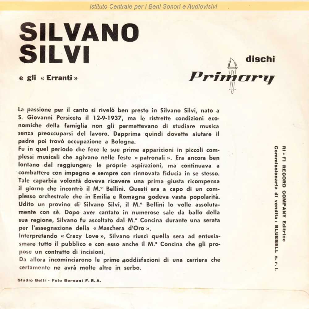 Note: Il retro di copertina è identico a quello di altri dischi di Silvano Silvi per la Primary, e riporta quindi come di consuteto gli Erranti come suo complesso accompagnatore; tuttavia nell'etichetta è riportato come complesso Eraldo Volonté e il suo Sestetto.