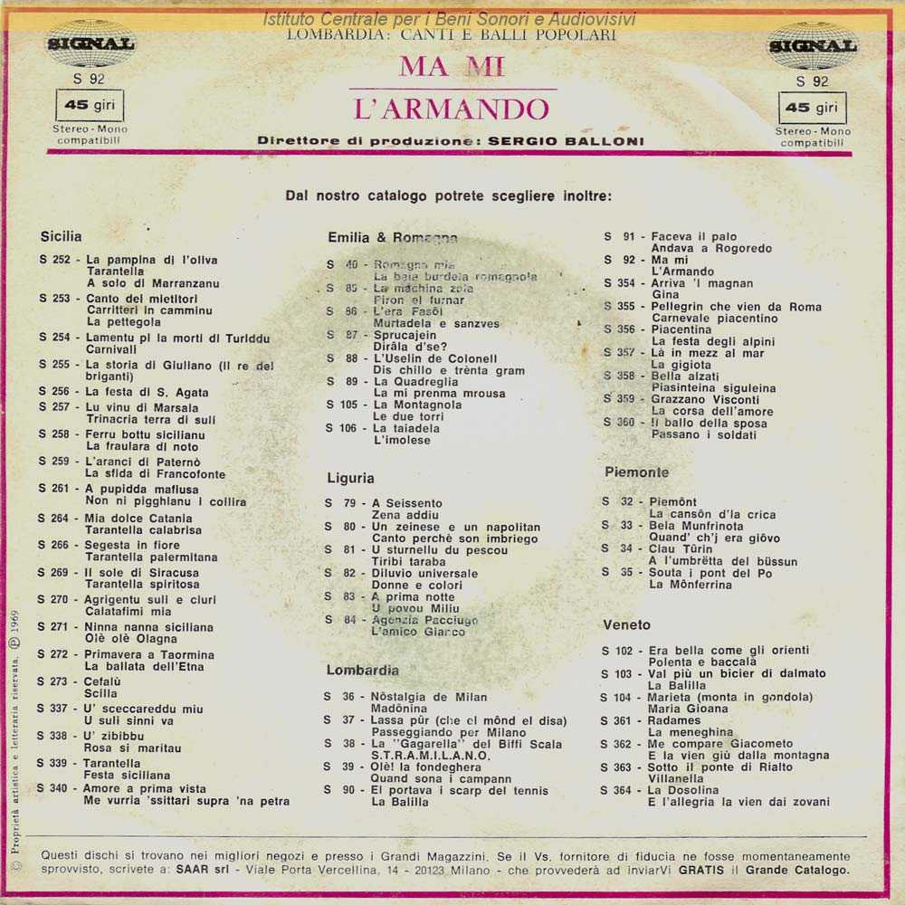 : Data matrici: 27 Ottobre 1964-4 Giugno 1964 / Ristampa di vecchie matrici Jolly - "L'Armando" in versione di studio come dal 45 giri Jolly "L'Armando-La forza dell'amore" / Distribuito da SAAR - Milano